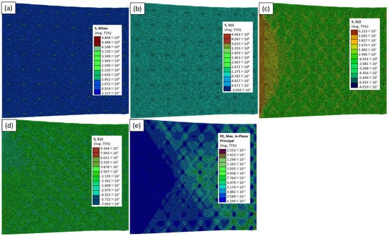 Simulation results for RVE−3 case: (a) σvm; (b) σxx; (c) σyy; (d) σxy; and (e) εmax distributions.