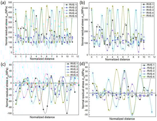Variations in equivalent and normal residual stresses of RVE−1, RVE−2, RVE−3, RVE−4, and RVE−5: (a) σvm; (b) σxx; (c) σyy; and (d) σxy.