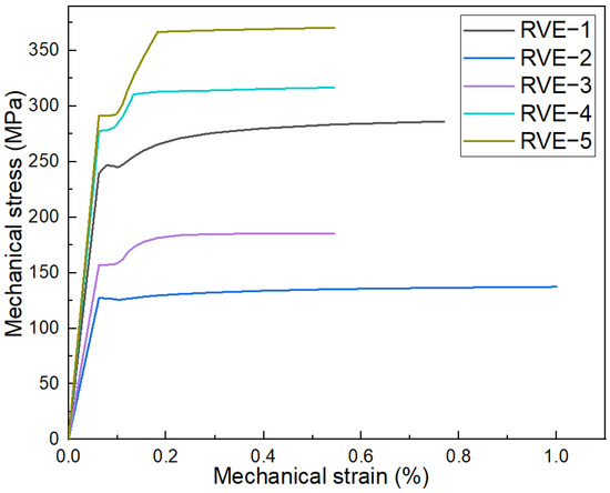 Stress–strain curves of RVE−1, RVE−2, RVE−3, RVE−4, and RVE−5 case models.