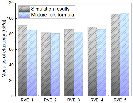 In Figure 13, the Young’s moduli of the Al–TiC composite models (RVE−1 to RVE−5 case models) are comprehensively examined through the simulation results and mixture rule formula (Equation (4)). The simulation-derived Young’s modulus values for each model are specified as follows: RVE−1 (91 GPa), RVE−2 (81 GPa), RVE−3 (84 GPa), RVE−4 (88 GPa), and RVE−5 (104 GPa). Correspondingly, the Young’s modulus values obtained through the mixture rule formula for each model are as follows: RVE−1 (85 GPa), RVE−2 (81 GPa), RVE−3 (82 GPa), RVE−4 (86 GPa), and RVE−5 (107 GPa). This detailed array of values provides profound insights into the distinct mechanical responses influenced by the various shapes and sizes of the TiC reinforcement within the aluminum matrix, further contributing to a nuanced understanding of the composite material’s behavior. Moreover, the comparison between the simulated and formula-derived Young’s modulus values highlights the efficacy of the simulation approach in predicting the composite material’s mechanical behavior. Notably, the simulation results align closely with the values obtained through the mixture rule formula, affirming the reliability of the finite element analysis in capturing the complex interactions between the aluminum matrix and TiC reinforcement. The observed variations in the Young’s modulus values among the different models underscore the nuanced influence of the particle size and shape on the composite’s stiffness. The previous studies provide a valuable foundation for the current analysis, offering insights into the key factors influencing the prediction of the stress–strain and Young’s modulus curves for the composites [30,31]. By evaluating the contributions of the aluminum matrix and titanium carbide reinforcement, this investigation serves to offer insightful information regarding the composite material’s overall mechanical properties. The stress–strain curve of the matrix model involves considering the contributions from both the aluminum matrix and the titanium carbide reinforcement. The overall stress–strain behavior of the composite can be determined by combining the stress–strain responses of the individual constituents using appropriate mixing rules. One commonly used mixing rule for predicting the stress–strain curve of the matrix is the rule of mixtures.