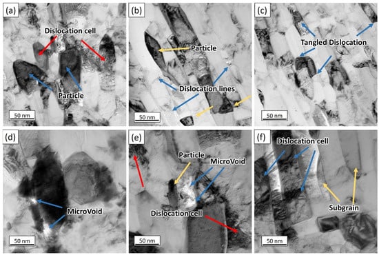 TEM images of AMCs after rolling reduction via ARB and CR processes: (a) dislocation cells and particles, (b) dislocation lines and particles, (c) tangled dislocation, (d) microvoids, (e) microvoids and particles, and (f) subgrain and dislocation cells after CR-5 sample.