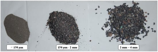 Mineral aggregates (quartz) in different diameters and with constant grain size are used in PC materials. The advantages of these wasted mineral aggregates include great bonding to polymers and high compressive strength. In Table 2, the chemical composition of this type of aggregate is presented. It should be noted that in order to remove the natural oil and wax that covers the surface of the mineral aggregates, before using them, their surface was treated and they were placed under a temperature of 100 °C for 3 h to dry. According to a previous study [], aggregates with different weight percentages and sizes (including 50 wt% with 2–4 mm, 20 wt% with 150 µm–2 mm, and 5 wt% under 150 µm) were used to manufacture the samples. Figure 1 shows the different sizes of the aggregates used in this study. To increase the mechanical properties and improve the performance of PC materials, glass fibers and metal chips obtained from the machining process [] were used. The metal chips used in this study were brass, and they were cleaned with acetone and cured at 50 °C for 30 min. Glass fiber was used from the composite sample that was made in advance. It is worth mentioning that if high-viscosity resin was utilized to manufacture the PC, the ingredients, particularly chopped glass fiber or aggregates, may be agglomerated. Therefore, in this study, low-viscosity (900–1100 cP at 25 °C) resin was used. In addition, in order to have a uniform mixture, all ingredients with their weight fractions were mixed inside a container using a mechanical stirrer for 5 min.