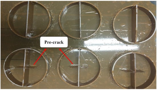 Researchers have used samples with different geometries for fracture and strength tests on PCs [,,,,,]. In this study, SCB samples were used to obtain the mode I fracture toughness, energy absorbed until failure, and tensile strength of PC materials. SCB samples were made from a mixture of epoxy resin, waste mineral aggregates, and fillers (brass chips and glass fibers). Figure 2 shows the circular molds used to manufacture the samples, which were created from PVC pipe cuts. Samples with a diameter of 105 mm and thicknesses of 30 mm and 22 mm were used for fracture and strength tests, respectively. An edge pre-crack was created by using an aluminum sheet with a thickness of 0.3 mm. The ratio of the crack length to the radius of the specimen was considered as 0.4. After one day, the specimens were taken out from the mold. The samples were then cured at 90 °C for 2 h. It should be noted that the samples were kept at room temperature for 7 days before the experiment. SCB samples with pre-crack were used for the fracture test and samples without cracks were used for the strength analysis. Figure 3 shows the test specimens. Table 3 also shows the details of the ingredients of the samples. For each condition, three samples were manufactured and tested.