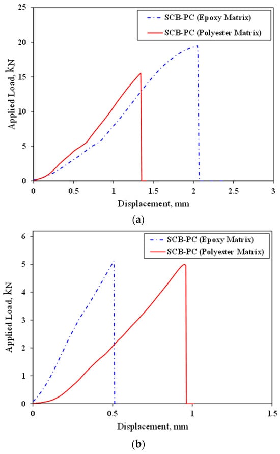 To select one of the resins considered in this study, SCB PCs without fillers were made using two matrices, epoxy and polyester. The tensile strength of neat epoxy and polyester are 74.6 MPa and 25.5 MPa, respectively [,]. Therefore, in the following, the PCs manufactured by two different matrices were analyzed in terms of strength and fracture toughness. In other words, the polymer concrete samples in this section have 75% mineral aggregates and 25% matrix; in one of the samples, epoxy was used as matrix, and in the other sample, polyester was used as matrix. Figure 5 shows typical load–displacement curves for each condition. In these curves, displacement was measured by the testing machine. Based on Figure 6, it is evident that the tensile strength of the PC made by the epoxy matrix is greater than that made by the polyester matrix. However, the fracture toughness values for both matrices are approximately equal. Additionally, it is important to mention that the epoxy resin has a longer gel time compared to the polyester matrix. The polyester matrix has a gel time of less than 10 min, which is unsuitable for fabricating PC specimens. Consequently, epoxy resin was chosen for the manufacture of the PC samples.
