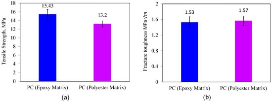 Tensile strength (a) and fracture toughness (b) of polymer concrete samples manufactured with two different matrices.