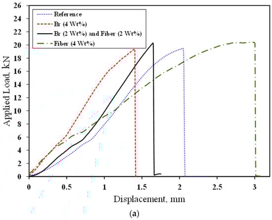 Figure 7 shows the typical load–displacement curves and tensile strength of PC with 4 wt% additives (different combinations). As shown, by adding brass chips and glass fibers, the tensile strength of the PC material does not change significantly. It should be noted that the reference legend in the following figures refers to PC manufacture by 75 wt% mineral aggregates and 25 wt% epoxy as matrix that does not contain any additives. Figure 8 shows the fracture surface of the tested samples. As crack growth is a gradual process, it does not break upon encountering the fibers. Instead, the matrix cracks elsewhere, resulting in a crack-arresting phenomenon.