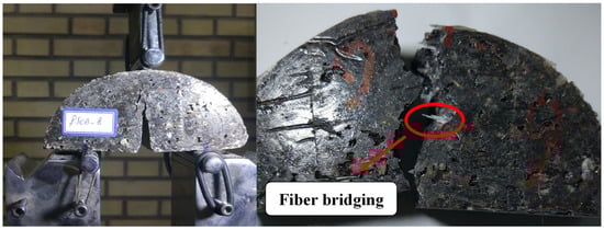 In Figure 12, the fracture surface of SCB specimens cracked under mode I loading is presented. The path of crack propagation observed in both strength and fracture tests originates from within the aggregates and at the interface between the aggregate and resin. The predominant failure mechanism identified in this study encompasses aggregate breakage, as well as adhesive and aggregate debonding. In fact, in samples without fillers, the predominant mechanism that inhibits crack growth or damage is aggregate fracture and debonding between the aggregate and adhesive. However, in samples containing fillers, in addition to these two mechanisms, the presence of fibers or metal chips can further impede crack growth and lead to multiple site cracking within the sample (see Figure 8).