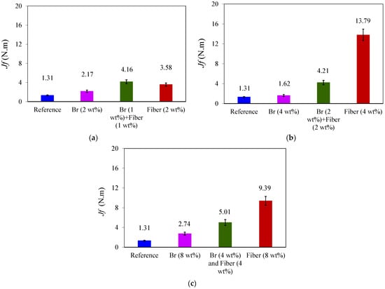 In Figure 11, the average fracture toughness values, determined using Equation (3), are presented. According to the obtained results, the mode I fracture toughness increased by 32% with the addition of 2 wt% brass chips, while 1 wt% glass fibers + 1 wt% brass chips improved the fracture energy by 53%. Also, the addition of 4 wt% glass fibers increased the fracture toughness by 156%. Furthermore, the incorporation of 4 wt% glass fibers along with 4 wt% brass chips resulted in a remarkable 61% increase in fracture toughness. Nevertheless, the most exceptional performance was achieved when solely glass fibers were introduced to the PC samples, yielding an impressive 92% improvement in fracture energy. Based on the experimental findings, it can be deduced that the addition of glass fibers exerts the most significant influence on the fracture energy of the tested PCs. Notably, the introduction of 4 wt% glass fibers demonstrates the most substantial effect in enhancing the mode I fracture toughness of the tested concretes.