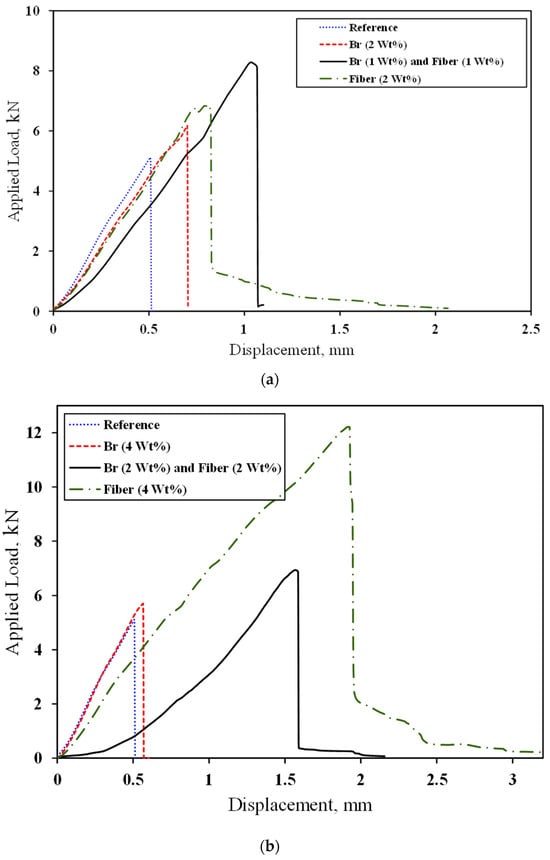displays the maximum load and maximum displacement at failure in fracture tests. Notably, the sample containing 4 wt% fiber exhibited a significant improvement, with a 139% increase in maximum load and a remarkable 578% increase in displacement at the point of final failure. It is worth mentioning the gradual failure observed in the SCB samples, which effectively mitigates abrupt failure.