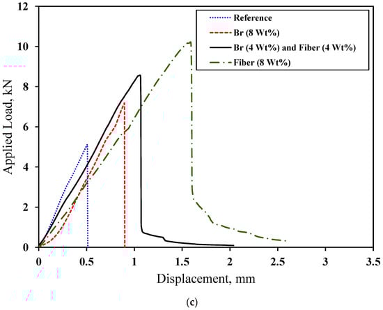 Load–displacement curves obtained for SCB samples with central crack in the states of (a) 2 wt%, (b) 4 wt%, and (c) 8 wt% under fracture test.