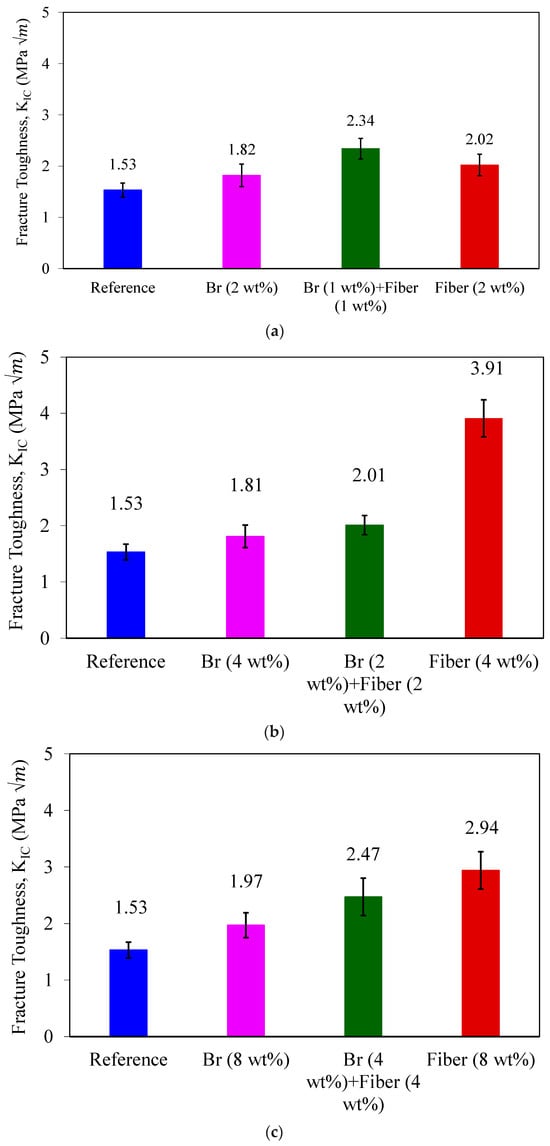 Average mode I fracture toughness of SCB specimens in the states of (a) 2 wt%, (b) 4 wt%, and (c) 8 wt% under fracture test.