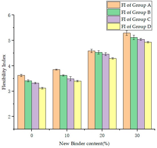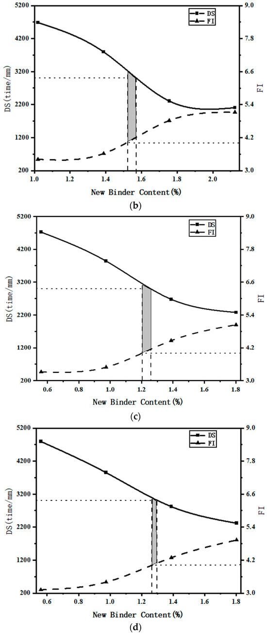 - Based on the balanced design of rutting and cracking resistance, the optimal new binder content for the Group A recycling asphalt mixture is 1.52%; for Group B, it is 1.55%; for Group C, it is 1.23%; and for Group D, it is 1.28%. As the RAP content increases, the rejuvenated aged binder positively influences the performance, reducing the amount of new binder added. However, the unactivated aged binder also increases, requiring more binder to meet the demand for crack resistance, leading to an overall increase in binder usage. With deeper binder aging and decreased viscosity, additional new binder is needed to restore the crack resistance, further contributing to the overall increase in binder consumption.