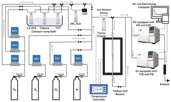 The performance of catalytic combustion for chlorobenzene was evaluated in a fixed-bed reactor consisting of a quartz tube (i.d. = 4 mm) under standard atmospheric pressure. In each experiment, 100 mg of catalysts (40–60 mesh) was immobilized using quartz wool, resulting in a gas hourly space velocity (GHSV) of 20,000 mL·g−1 h−1 and a total flow rate of 33.33 mL·min−1. The liquid reactant (chlorobenzene) was introduced into the feed stream by passing dried air through a saturator maintained at a temperature of 6 °C. The feed stream was then diluted with dried air generating a feeding flow containing 1000 ppm reactant and 21% O2/79% N2. Flow rates were regulated using online mass flowmeters. Concentrations of CB and chlorinated byproducts were determined via analysis on an online gas chromatograph (GC3420A, Beifen Ruili Co., Ltd., Beijing, China) equipped with both flame ionization detector (FID) and electron capture detector (ECD) for quantitative assessment of organic compounds. Furthermore, the outlet CO2 underwent reduction by hydrogen within a methanation furnace before being detected by the same chromatograph system. A K-type thermocouple was inserted into the catalyst to monitor its temperature during the catalytic performance test. Data of catalytic oxidation tests were collected after achieving steady state conditions for at least thirty minutes. The detailed structure of the catalytic test system is shown in Figure 1.