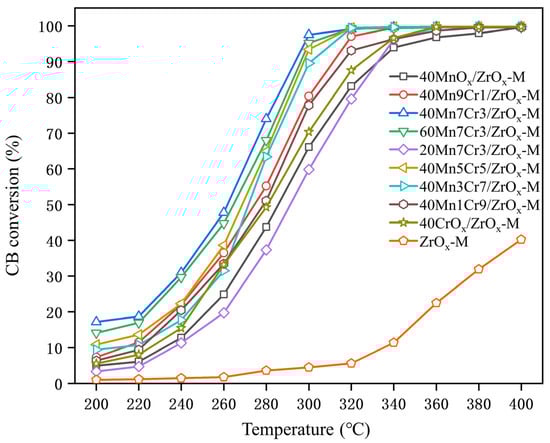 The chlorobenzene conversion curves over MnCr/ZrOx-M catalysts; gas composition: 1000 ppm chlorobenzene; GHSV = 20,000 h−1; catalyst amount: 100 mg.