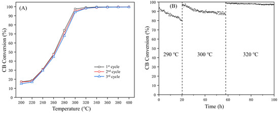 The three-cycle conversion curves over 40Mn7Cr3/ZrOx-M (A) and the stability of the 40Mn7Cr3/ZrOx-M catalyst (B); gas composition: 1000 ppm chlorobenzene; GHSV = 20,000 h−1; catalyst amount: 100 mg.