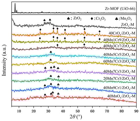 XRD patterns of Mn-Cr/ZrOx-M series catalysts and Zr-MOF are shown in Figure 4. The pattern of Zr-MOF (UiO-66) synthesized via the solvothermal method is consistent with the reported literature []. After calcination, the typical characteristics peaks of UiO-66 disappeared and obtained ZrOx-M catalysts derived from UiO-66 exhibited weak diffraction peaks of orthorhombic phase ZrO2 (PDF#41-0017), suggesting that UiO-66 decomposed into amorphous ZrO2. The EDS results of ZrOx-M also proved that organic ligands complete decomposed, leaving only a minimal amount of residual carbon species. Several characteristic peaks at 24.5°, 33.6°, 36.2°, 41.5°, 54.9°, and 65.1° were detected on 40CrOx/ZrOx-M, and they were assigned to the rhombohedral phase of Cr2O3 (PDF#06-0504) []. However, no peaks corresponding to ZrO2 were detected, suggesting that the Cr species were incorporated into the lattice of ZrO2 rather than physically loaded onto its surface. This incorporation led to a further decrease in the crystallinity of ZrO2. In contrast, diffraction peaks corresponding to both cubic phase Mn2O3 (PDF#10-0069) [] and ZrO2 were observed on the 40MnOx/ZrOx-M, suggesting that MnO2 was simply loaded on the surface of ZrO2. After the introduction of Mn into 40CrOx/ZrOx-M, the characteristic peaks of Cr2O3 were significantly weakened, indicating that Mn infiltrated the lattice of Cr2O3 and formed an amorphous structure. No diffraction peaks for Mn5Cr5, Mn7Cr3 and Mn9Cr1 were detected, suggesting that Mn and Cr species were highly dispersed on the ZrOx support. The amorphous structure demonstrated strong interactions between manganese and chromium, which promoted the generation of lattice defects and the formation of oxygen vacancies, thus improving catalytic performance [].