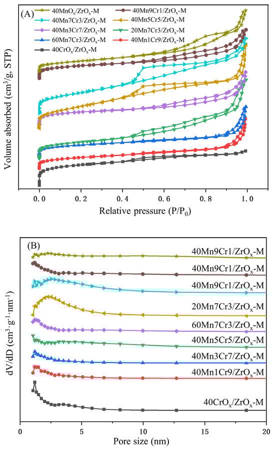 To investigate the texture characteristics of the as-prepared catalysts, nitrogen adsorption–desorption measurements were conducted. The isotherms for adsorption–desorption of nitrogen and the distribution of pore sizes (using BJH method) for Mn-Cr/ZrOx-M series catalysts are illustrated in Figure 6A and Figure 6B, respectively. The corresponding results, including the specific surface area (SBET), average pore size (Dp), and total pore volume (Vp) of the catalysts, are summarized in Table 2. All catalysts presented a typical IV adsorption isotherm with H3-type hysteresis loops, revealing the mesoporous structure of catalysts, which can be further confirmed by the pore size distribution results []. Compared to the conventional sol–gel method and co-precipitation method, catalysts utilizing a porous ZrO2 substrate exhibited a significantly enhanced specific surface area, thereby facilitating the exposure of acid sites and active sites []. The CrOx particles exhibited a smaller size compared to MnOx, allowing them to infiltrate into the mesoporous channels of MnOx and create additional pore structures [,]. However, an excessive amount of CrOx caused a blockage in the mesopores channel of MnOx, leading to a significant decrease in the specific surface area. As the Cr content increased, there was initially an increase in the specific surface area observed for the catalysts, followed by a subsequent reduction. This observation is consistent with the findings from scanning electron microscopy (SEM) analysis. Among all the catalysts, 40Mn7Cr3/ZrOx-M exhibited superior specific surface area and pore volume. This resulted in reduced diffusion resistance between chlorobenzene molecules and the active sites of the catalysts, ultimately enhancing their catalytic performance.
