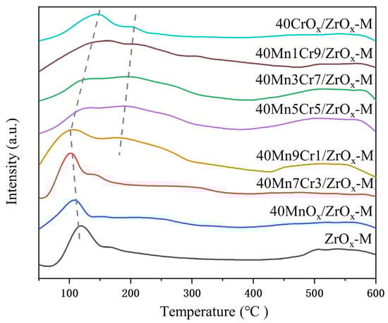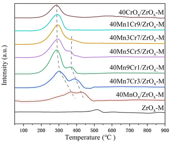 The redox property of Mn-Cr/ZrOx-M series catalysts was investigated via H2-TPR, and their profiles are shown in Figure 8. In general, the valence state and the quantity of active oxygen are crucial to redox performance []. For ZrOx-M, a weaker reduction peak was observed at around 520 °C, suggesting that the pristine ZrOx-M support exhibited relatively modest reducing performance. The profile of 40MnOx/ZrOx displayed two reduction peaks at 375 °C and 440 °C, corresponding to a reduction in Mn4+ and Mn3+, respectively []. Generally speaking, the reduction in MnOx-based catalysts, which undergo successive processes of MnO2 → Mn3O4/Mn2O3 → MnO, corresponds to low-temperature reduction peaks (<400 °C) and high-temperature reduction peaks, respectively []. The 40CrOx/ZrOx-M catalyst presented a significant reduction peak at 300 °C, corresponding to the reduction in Cr6+ to Cr3+ []. After doping Cr into 40MnOx/ZrOx-M, it was observed that the reduction peaks of Mn4+ and Cr6+ merged to form a larger peak. This suggests that there was a strong interaction between MnOx and CrOx, which enhanced the mobility of the surface lattice oxygen and subsequently improved catalytic activity []. Moreover, the addition of Cr led to increased reduction peak areas that shifted towards lower temperatures, thereby enhancing the redox performance at low temperatures []. However, excessive Cr doping resulted in the absence of a reduction peak at 375 °C, indicating the weaker redox ability of Mn3Cr7 and Mn1Cr9. The 40Mn7Cr3/ZrOx-M catalyst exhibited the largest H2 reduction peak at the lowest temperature, suggesting excellent redox activity. These findings are consistent with the results of the catalytic performance test.