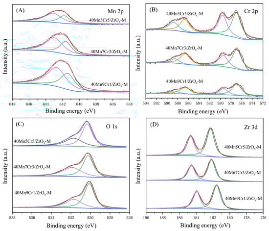 XPS spectra of the MnCr/ZrOx-M catalysts: (A) Mn 2p; (B) Cr 2p; (C) O 1s; (D) Zr 3d.