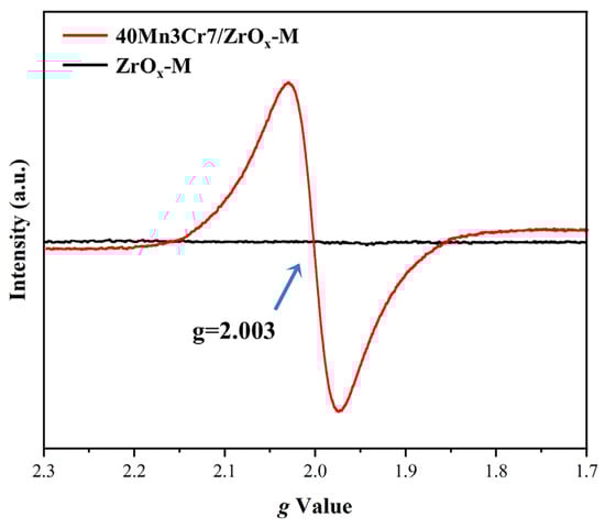 As shown in Figure 10, the EPR profile of the Mn-Cr/ZrOx-M catalysts presented a signal-centered g = 2.003, which could be attributed to the electrons trapped in oxygen vacancies []. In addition, the EPR signal intensity of 40Mn7Cr3/ZrOx-M was significantly higher than that of ZrOx-M. This suggests that the loaded MnCrOx can offer abundant oxygen vacancies.