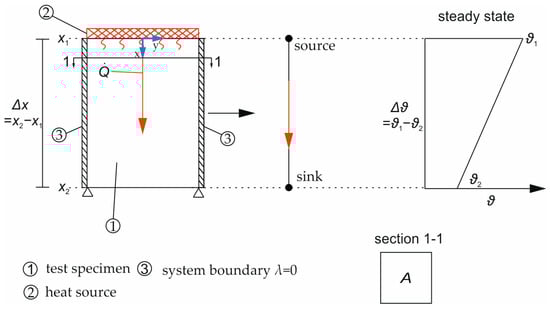 For evaluation, the setup is interpreted as a 1D system, as shown in Figure 1 at the center, with a linear temperature distribution in the steady state between the source and the sink (right). To derive λ for the tested material, the temperature gradient , over the length  (here,  = specimen height), and the heat flux  from the external heat source induced over the cross-sectional area A are substituted into Equation (8).