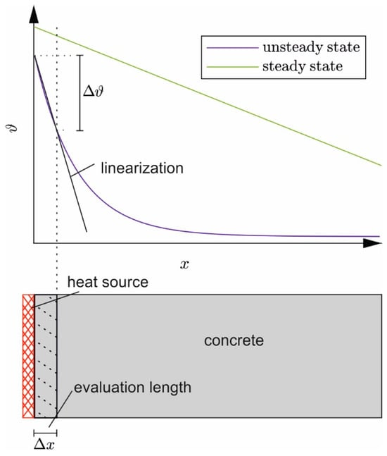 The test-based evaluation of λ according to Equation (8) requires a linear temperature distribution over . Figure 2 sketches the temperature distribution in the specimen for the steady state and when heating just has started (unsteady state). Initially, the temperature only increases near the heat source; deeper layers do not yet experience a rise in temperature—an almost linear temperature gradient only develops in the boundary layer near the heat source. To derive λ at this early stage, the evaluation length  needs to be limited to a near-surface layer.