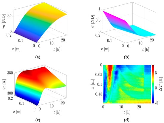 Numerical solution of Equations (9)–(11) for the parameters of Table 2 and the error between measured and numerically calculated temperature: (a) evolution of maturity; (b) evolution of moisture; (c) evolution of temperature; (d) error between the measured and numerically calculated temperature.