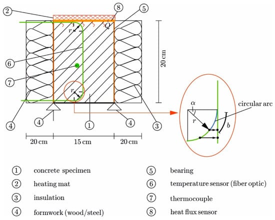 To measure the transient temperature field, fiber optic sensors (DFOS) were laid longitudinally in capillaries in the concrete (no. 6 in Figure 4) []. The capillary prevents contact between the fiber and the surrounding concrete, so the fibers are not subjected to mechanical strains, allowing for the measurement of pure thermal strains []. The distance of the measuring points (gauges) along the fiber was 0.65 mm, and the measuring frequency was 1 Hz. Due to the heating mat on top and the steel formwork at the bottom, the DFOS could not be laid straight through the test specimen. Instead, the fiber had to be led out to the side geometrically following a circular arc (detail in Figure 4), with a 2 mm distance to the surfaces on the top and bottom. A minimum radius of r > 1 cm is required to bend but not destroy the fibers []. Here, that radius was selected as r = 3.5 cm. This bending of the fiber had to be compensated in the postprocessing stage to ensure the precise location of each gauge along the vertical axis (y). The gauges along the circular arc were converted into an equivalent straight line, as shown in Figure 4 on the right.