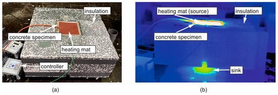 Figure 5a shows a photo of the experimental setup and a corresponding thermal image from infrared thermography during the experiment Figure 5b. Figure 5a shows the heating mat with concrete underneath, temperature controller, and lateral insulation. The insulation on the heating mat has been removed for the photo. The infrared thermography on Figure 5b gives an impression of the heat propagation in the test specimen and the effectiveness of the insulation. Heated areas with a temperature of about 80 °C are color-coded in red to white, while the cold regions with temperatures of about 20 °C are blue. The heat induced at the top flows through the concrete and transfers to the non-insulated bottom.