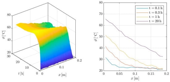 Figure 6 on the right displays the temperature distribution recorded over the sample height at discrete time points. After 0.1 h of heating, the temperature distribution in the boundary layer (x ≤ 0.04 m) is almost linear. The deeper layers do not yet exhibit any significant temperature increase. With continued heating, the length of the almost linear distribution increases. The maximum temperature in the stationary state is approx. 68 °C. This is attributed to the measurement distance of 2 mm from the concrete surface and the unavoidable unevenness of the tempered concrete surface with corresponding losses [].