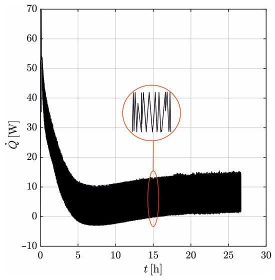 Figure 7 shows the induced  over time recorded with the heat flux sensor. The heating mat induces  = 55 W in the beginning. Meeting the set temperature of 80 °C, the controller of the heating mat keeps it constant by switching “On” and “Off” selectively as soon as the measured temperature deviates from the wanted temperature by 0.5 °C. The heating mat induces either full or no heat, which results in an alternating course of  in the sensor (detail in Figure 7). Since the temperature gradient between the heating mat and the concrete decreases with time,  also decreases on a global scale. In the period 5–10 h,  is partially negative. This can be attributed to the dissipation of the hydration heat. In the stationary state, the mean value of  is constant at about 6 W throughout.