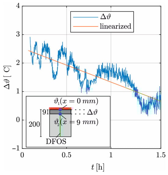 Figure 8 shows the time course of  over  derived from the DFOS measurements, with  = ( in the interval 0.08 to 1.5 h. For t < 0.08 h, the temperature distribution over  is nonlinear. The alternating course of  (Figure 7) is also found here to be attenuated in time due to the inertia of concrete heating. Therefore, the linearization of the curve by minimizing the mean-squared error is required for the evaluation.
