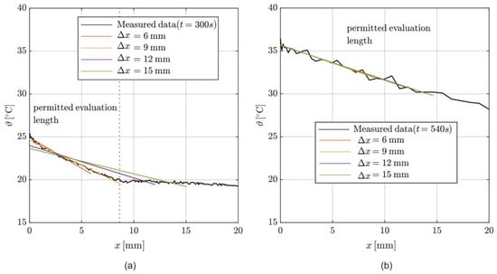 To evaluate λ according to Equation (8), a linear temperature distribution over  is necessary. Figure 10 shows the temperature distributions measured by DFOS in the interval x = [0, 20 mm] of the specimen for t = 300 s Figure 10a and t = 540 s Figure 10b, with the linearization of the temperature profile on varying . For t = 300 s, the temperature only increases in the top layer (x ≤ 8.7 mm), as indicated by the vertical dashed line Figure 10a. The temperature distribution measurements show high consistency with the linearization for Δx = 6 mm and Δx = 9 mm, with determination coefficients of R2 = 0.91 and 0.95, respectively. A more extended evaluation length underestimates the temperature gradient, resulting in R2 = 0.83 and 0.74 for Δx = 12 mm and 15 mm.