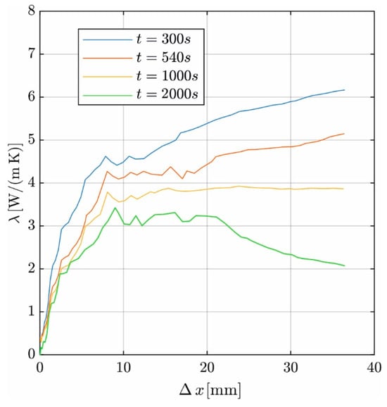 Figure 11 shows the effect of varying Δx (abscissa) in the range between 1 mm and 38 mm on λ (ordinate) at different times. At all times, a plateau of stable results for λ is achieved, starting from Δx = 9 mm. The length of the plateau increases as the tempering time increases. The curves rise for t = 300 s and t = 540 s as the temperature distribution is nonlinear along the evaluation length. For longer temper times, the curve decreases for Δx > 20 mm due to the increasing impact of the hydration heat. For Δx < 9 mm, the linearization is less robust against the measurement uncertainty and nonlinearity of the measured course due to the small number of measuring points. This causes the evaluated λ-values to decrease almost linearly.