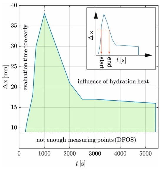 The plateau defines the permissible Δx. The results support the selection of Δx = 9 mm in Section 3.4. For Δx > 9 mm, the evaluation is robust against measurement uncertainties. On the other hand, a short evaluation length is more robust against the effects of hydration heat.