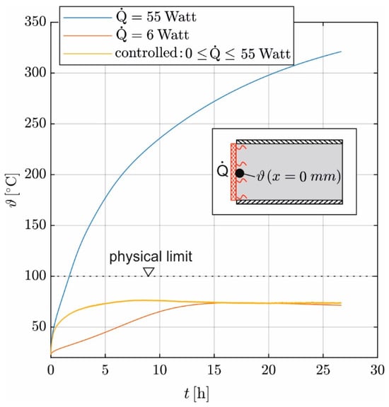 One approach to simplify the evaluation is to induce a constant . Figure 13 shows the calculated temperature development of the heating mat and, consequently, the concrete temperature at the top of the sample for constant  values of 6 W and 55 W. The calculation is carried out using the digital twin described in Section 2.4, with 55 W corresponding to the maximum  of the used heating mat and 6 W corresponding to the recorded mean  in the stationary state to maintain the temperature constant at 80 °C. These are compared with the calculated temperature curve for a two-point controlled heat flux with  = 55 W.