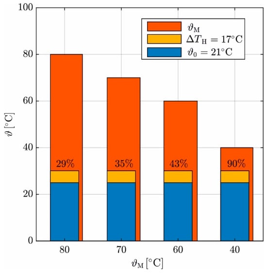 The maximum concrete temperature results from the externally supplied heat plus the hydration heat and is limited to 100 °C. The increase in the temperature due to the hydration heat  is approx. 17 °C for the investigated concrete and dimensions []. The heating mat reacts to the hydration heat with a delay due to the inertia of concrete heating and reduces , so the concrete does not exceed the set temperature. Therefore, the maximum reached temperature in Figure 13 is only slightly above 80 °C. So, a temperature of the heating mat  > 80 °C is also possible, e.g., 95 °C. The experimental work in [] shows that a heat treatment accelerates hydration, but higher tempering does not increase . Consequently, if  decreases, the proportion of  in concrete temperature increases. For  = (80, 70, 60, 40) °C, Figure 14 shows the proportion of  to (-); the ambient temperature  = 21 °C is constant during the experiment. The relative share of  to  increases from 29% to 90% as  is reduced.