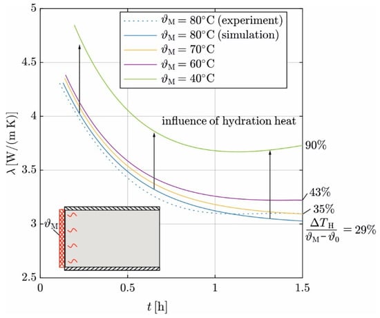 Figure 15 shows the simulation results for λ and the results from the experiment. For  = 80 °C, the determination coefficients between the experiment ( and simulation ( is R2 = 0.96. Reducing  leads to an increase in the derived λ values; the curves shift upward. This can be attributed to the effects of hydration heat on .  between the heating mat and concrete exhibits delayed response to the additional heat from hydration and initially remains constant, resulting in a decrease in the derived λ. This effect increases as  decreases.