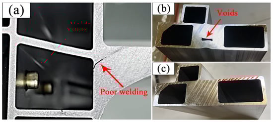 Dimensions and key structures of profile sections: (a) abnormal welding of profiles and holes caused by abnormal filling; (b) abnormal hole filling at the thick wall of profile 2; (c) normal cross-section of profile 2.