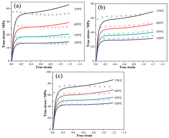 By conducting isothermal hot compression tests under different temperature and strain conditions and recording the corresponding mechanical behavior data, the stress–strain data of 6061 alloy under different deformation conditions can be obtained, as shown by the scattered hollow block symbols in Figure 4.