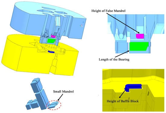 In order to elucidate the functional relationship between the optimization objectives SDV, SDP, the maximum thick wall hydrostatic pressure, and the design variables, such as the height of baffle plates (0 mm, 3 mm, 6 mm), the length of the bearing (8 mm, 14 mm, 20 mm), and the height of the false mandrel (0 mm, 4 mm, 8 mm), the experimental design was carried out according to the Box–Behnken test method, and 17 three-dimensional geometric models of the die were constructed according to the test requirements.