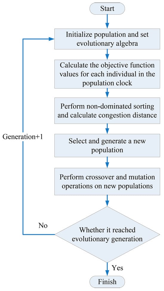 In recent years, various multi-objective optimization intelligent algorithms have been rapidly developed, and various algorithms with excellent performance indicators have emerged, such as DNEA, HREA, SMPSO, etc. Compared with these, the second-generation NSGA2 (non-dominated sorting genetic algorithm II) with an elite retention strategy does not have outstanding performance in fast non-dominated sorting algorithms []. However, as a classic multi-objective optimization algorithm, the NSGA2 algorithm has been successfully applied in multiple fields, proving its applicability and practicality. It has a solid theoretical and applied foundation. Thanks to the maturity of the algorithm, multiple open-source NSGA2 implementation tools are available, and researchers and engineers can easily apply the algorithm to their own problems. At the same time, some aspects of its performance, such as computational efficiency and convergence, still have certain advantages compared to other algorithms [,,]. In this study, we use the NSGA2 algorithm to coordinate the calculation of the relationship between the three objective functions. The specific optimization process is shown in Figure 7.