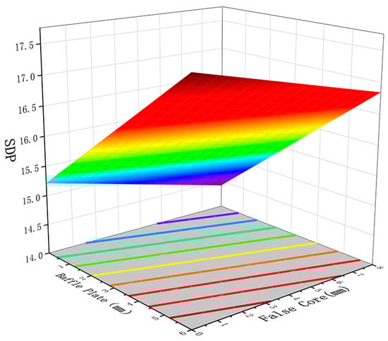 Figure 8a shows the effect of the interaction between the length of the bearing and the height of the false mandrel on the standard deviation of the section velocity. It can be observed from the figure that the standard deviation of the section velocity (SDV) decreases with the increase in the height of the false mandrel, indicating that the increase in the height of the false mandrel has a positive effect on the balance of the profile discharge. In addition, with the increase in the working band length, the SDV value first decreases and then increases, which indicates that there is a specific working band length to minimize the SDV value under this interaction condition. Figure 8b shows the effect of the interaction between the length of the bearing and the height of the baffle plates on the standard deviation of the section speed. Under this interactive condition, the SDV value will decrease with the increase in the height of the baffle plates, indicating that the greater the height of the baffle plates, the better the balance of the profile discharge. With the increase in the height of the bearing length, the SDV value first decreases and then increases, and the SDV value can be optimized under a certain bearing length.
