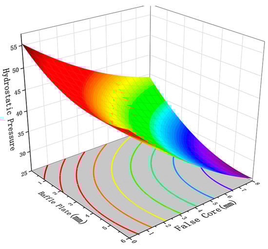 Figure 9 and Figure 10 show the influence of the interaction between the height of the baffle plate and the height of the false mandrel on the pressure standard deviation and the pressure at the thick wall. As shown in Figure 9 and Figure 10, the increase in the height of the false mandrel and the height of the baffle plate will increase the standard deviation of the profile pressure and reduce the hydrostatic pressure at the thick wall. This is because the resistance of the thick wall part is small, resulting in the low distribution of hydrostatic pressure on the profile section, while the false core restricts the metal filling space, and the material blocking platform restricts the metal flow to a specific area. These two factors not only reduce the hydrostatic pressure at the thick wall but also increase the pressure instability of the entire profile section, resulting in the increase in the pressure standard deviation [,].