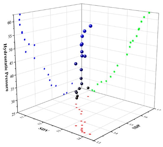 According to the analysis in Section 3.1 and Section 3.2, the three quality objectives examined in this paper (SDV, SDP, and TWHP) are independent and have certain internal relations. Finding a target to improve to the greatest extent without sacrificing the other two objectives constitutes a Pareto optimal solution set problem. This paper uses the NSGA2 multi-objective optimization genetic algorithm to solve the problem. The parameter settings are as follows: the initial population number is 100, the crossover probability is 0.8, the mutation probability is 0.1, and the number of iterations is 100. The Pareto optimal solution set is obtained through MATLAB 2022a programming, as shown in Figure 11.