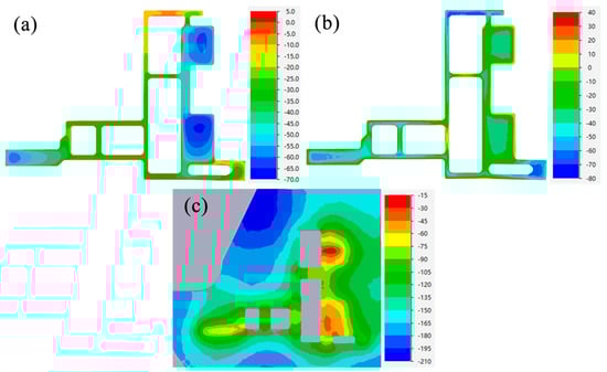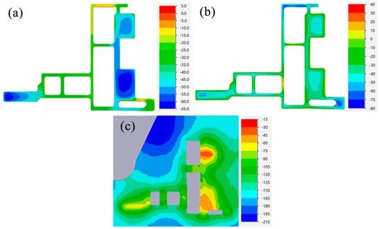 Figure 12 and Figure 13 show the profile section SDV, SDP and TWHP values at the die exit of different design schemes. From the comparison of Figure 12a and Figure 13a, it can be seen that there is little overall difference in the cross-section velocity distribution of the profiles in the two schemes, and the variation in the velocity difference is mainly concentrated on both sides of the small mandrel. The comparison between Figure 12b,c and Figure 13b,c shows that the pressure distribution changes are mainly concentrated in thick wall area A, the hydrostatic pressure value of the optimized thick wall area A is significantly increased, and the distribution range of a high pressure value is increased. It can be seen that when the length of the bearing increases from the initial design of 8 mm to 20 mm, the blocking effect caused by friction restricts the flow of metal in thick wall area A, while the height of the false mandrel decreases from 4 mm to 1.5 mm and the baffle plate is completely removed, promoting more metal to gather in the thick wall area and increasing the volume of metal actually participating in the formation. Under the combined action of the two, the relative velocity in area A decreases and the hydrostatic pressure increases, which plays a role in balancing the velocity and pressure on the profile section.