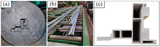(a) Physical drawing of die; (b) extrusion production process; (c) macrostructure of profile.