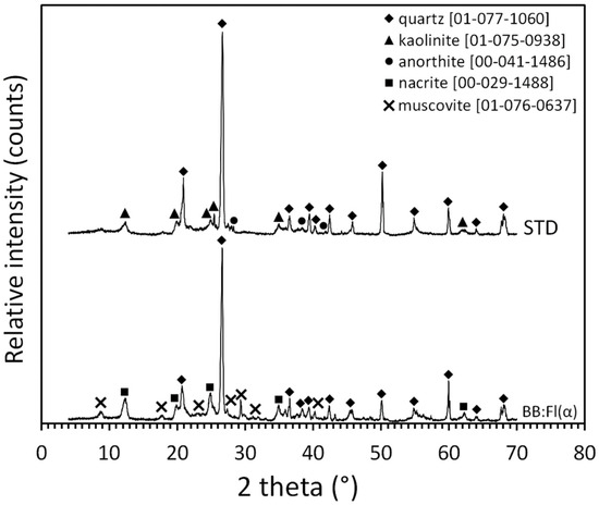 The oxides of the chemical elements, in their most stable forms, can be observed in the X-ray diffraction patterns of the samples (Figure 4), where quartz (SiO2, reference code: 01-077-1060) can be observed in its free form in both samples. In STD, kaolinite ((Al,Mg,Fe)4(Si4O10)(OH)8; reference code: 01-075-0938), which is a clay mineral, is present. In BB:Fl(α), nacrite (Al2Si2O5(OH)4; reference code: 00-029-01488), which is a polymorphic clay mineral of kaolinite, was observed. In STD, anorthite (CaAl2Si2O8; reference code: 00-041-1486), which is a plagioclase feldspar, is also observed. In BB:Fl(α), muscovite (KAl2O10(OH, F)2; reference code: 01-076-0637), which is a clay mineral, is also observed.