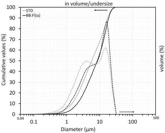 The particle size distributions (Figure 5 and Table 7) of both samples were bimodal, with STD showing a smaller particle diameter compared with BB:Fl(α). Among the residues originating from the coal beneficiation process, the studied residue had a smaller diameter owing to the beneficiation method, which was flotation.