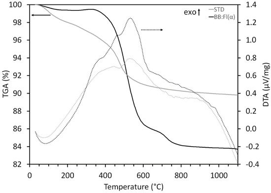 The thermal behavior of BB:Fl(α) exhibited an initial loss associated with superficial water, bound water, empty water, and gases [87]. The thermal decomposition at 300–800 °C occurred intensely and was possibly related to the dehydroxylation of the clay minerals present in the sample and the residual carbon, which gradually burned and released heat during the heating process [88].